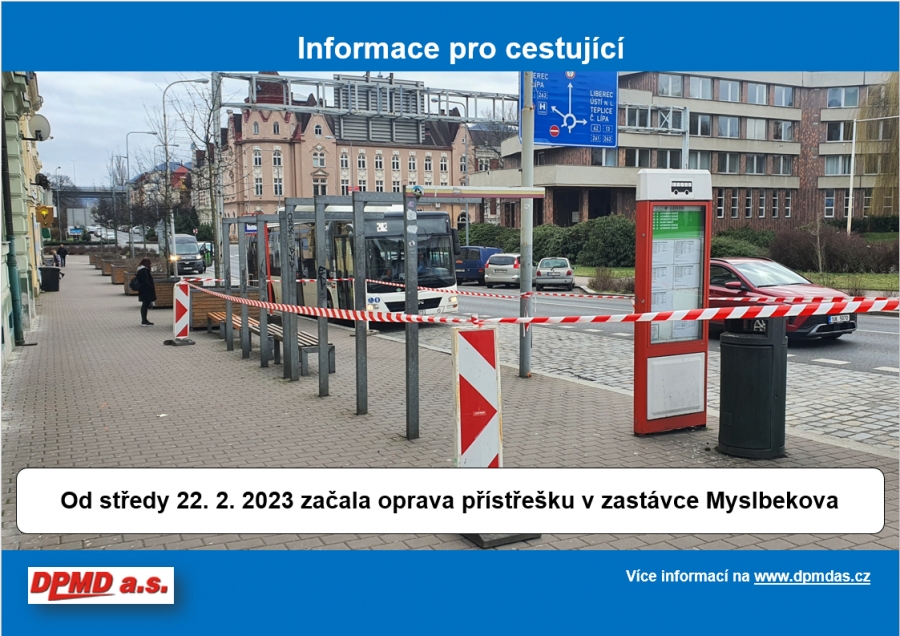 Od středy 22. 2. 2023 probíhá oprava přístřešku v zastávce Myslbekova a tím došlo k posunu označníku o cca 15m zpět. Po dokončení této opravy dojde k opravě i přístřešku v opačném směru.
